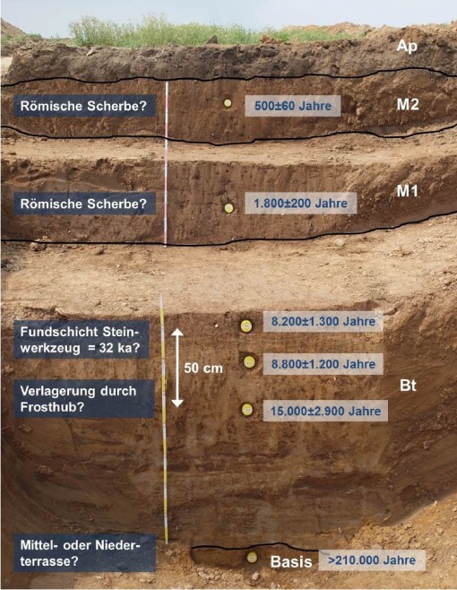 Inden Pier. Das Profil WW 2012/0013, Stelle 9 am Hangfuß des Güldenbergs mit den Altereinschätzungen (links) und den gemessenen OSL-Altern (rechts). Foto: R. Lubberich/LVR-ABR, ergänzt von S. Merkel/Universität Köln