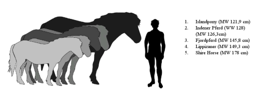 Durchschnittliche Widerristhöhe der Indener Pferde im Vergleich zu modernen Pferderassen und einem 1,80 m großen Menschen (von vorne nach hinten: Islandpony, Indener Pferd, Fjordpferd, Lipizzaner und Shire Horse; MW= Mittelwert; Zeichnung: Nadine Nolde).